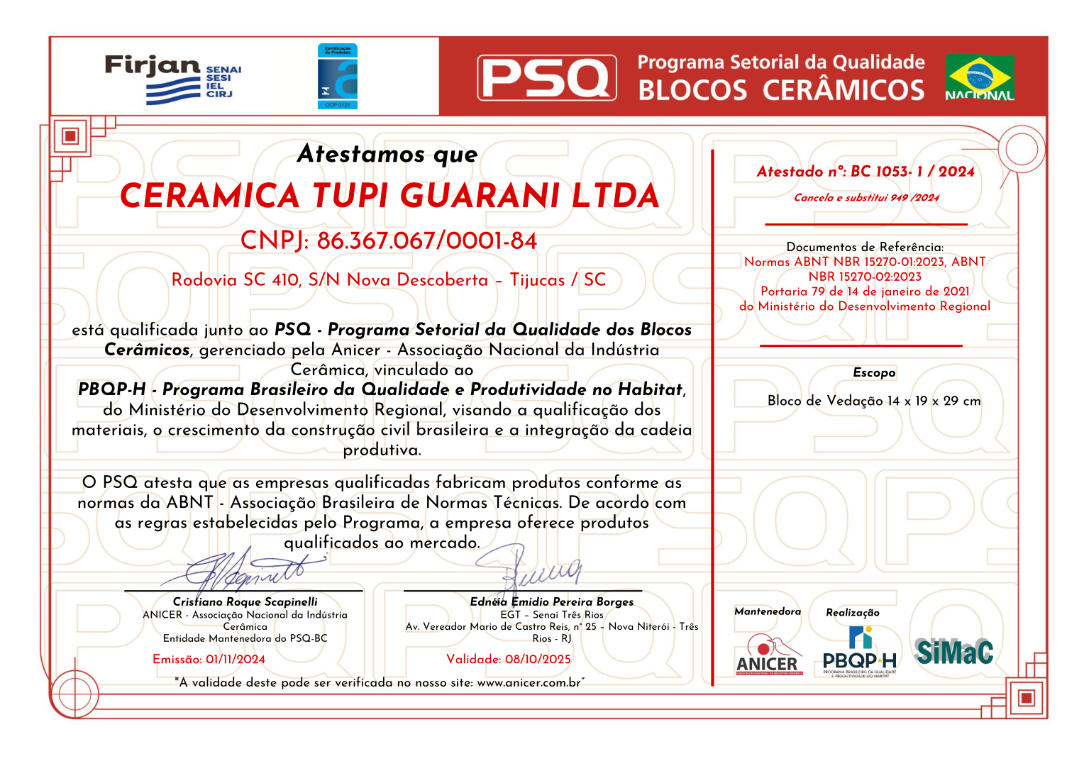 Os tijolos fabricados pela nossa empresa possuem o Laudo PSQ (Programa Setorial da Qualidade) da ANICER (Associação Nacional da Indústria de Cerâmica para Construção). Esse selo de qualidade atesta que nossos produtos atendem aos rigorosos padrões técnicos e de segurança exigidos pelo setor. A certificação PSQ garante que os tijolos são fabricados com materiais de alta qualidade e submetidos a testes de desempenho, oferecendo maior durabilidade, resistência e confiabilidade para as obras em que são aplicados. Com isso, nossos clientes podem ter a certeza de que estão adquirindo um produto de excelência, alinhado às melhores práticas do mercado.